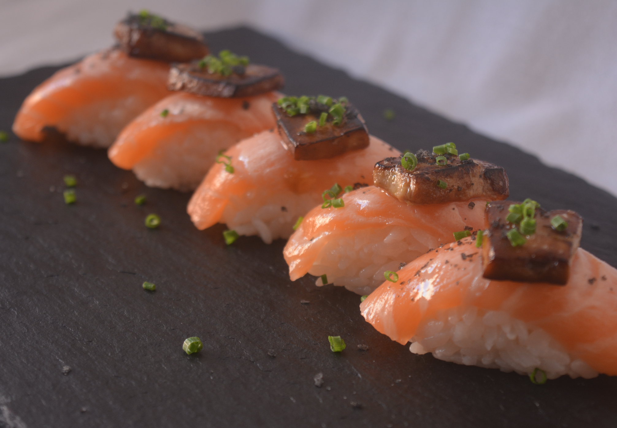 Nigiris de salmó flamejat amb foie