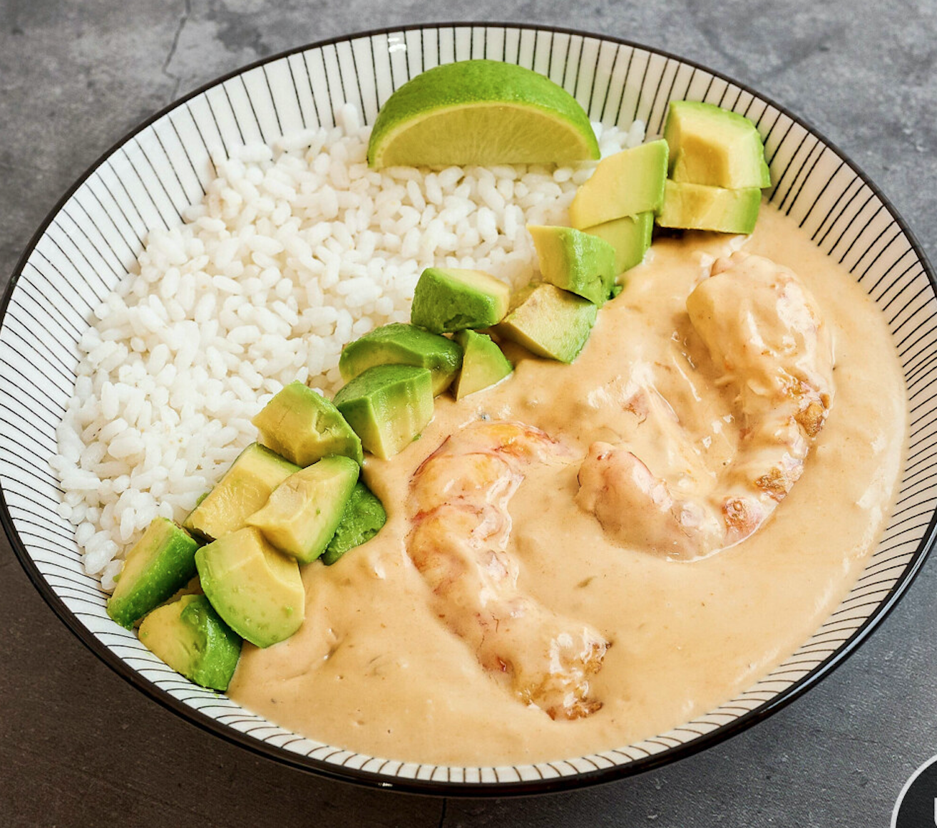 Llagostins saltejat amb llet de coco i curri vermell, servit amb arròs blanc i alvocat